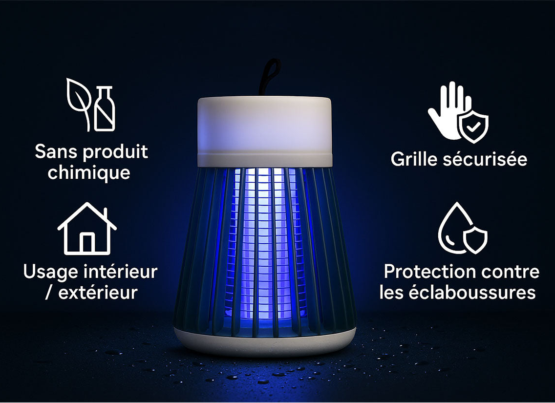 Attire et élimine les moustiques dans une zone de 10 à 50 m² sans bruit (≤35 dB).